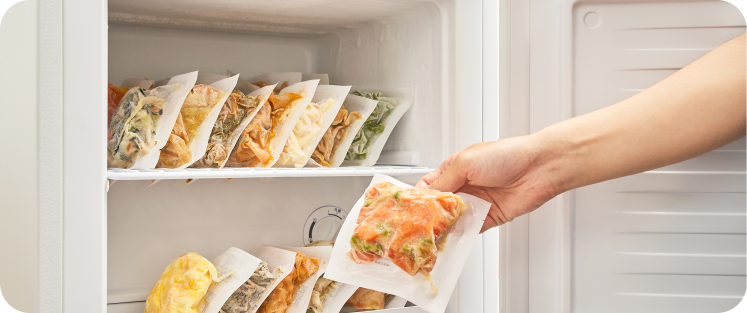 一品ずつ小分けの冷凍パック一品ずつ鮮度が維持された真空パックにしてお届けします。副菜だけでなく主菜となるメニューもありますので、日々の食卓に合わせてお使いください。